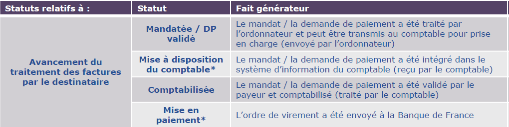 - * Les statuts « Mise à disposition du comptable » et « Mise en paiement » sont mis à jour par l’application Hélios pour les entités du secteur public local qui y sont raccordées.